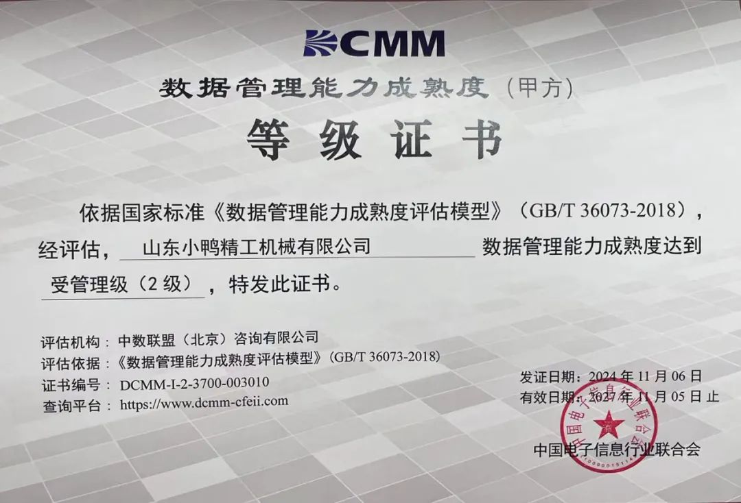 經(jīng)專家組評(píng)估,依據(jù)國家標(biāo)準(zhǔn)《數(shù)據(jù)管理能力成熟度評(píng)估模型》(GB/T36073-2018),小鴨精工榮獲DCMM2級(jí)證書,數(shù)據(jù)管理能力成熟度達(dá)到受管理級(jí)(2級(jí)),這一榮譽(yù)不僅是對(duì)小鴨精工數(shù)據(jù)管理工作的肯定,也是對(duì)小鴨精工智能制造軟件系統(tǒng)成熟度的認(rèn)可。