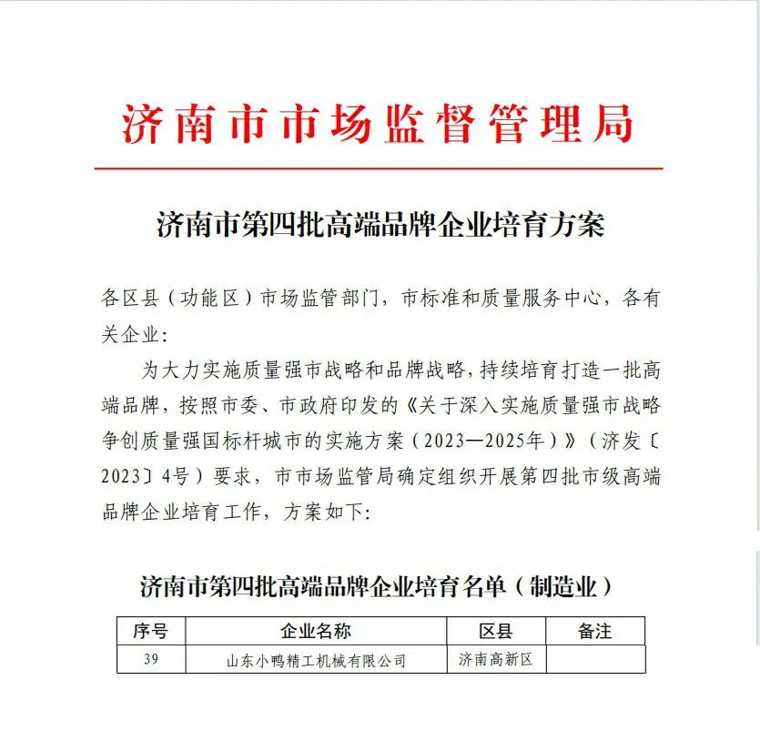 濟(jì)南市市場(chǎng)監(jiān)督管理局公布了濟(jì)南市第四批高端品牌企業(yè)培育名單。經(jīng)組織申報(bào)、資格審查、專(zhuān)家評(píng)審、綜合評(píng)價(jià)、結(jié)果審定等層層選拔,小鴨精工成功入選高端品牌企業(yè)培育名錄(制造業(yè))。